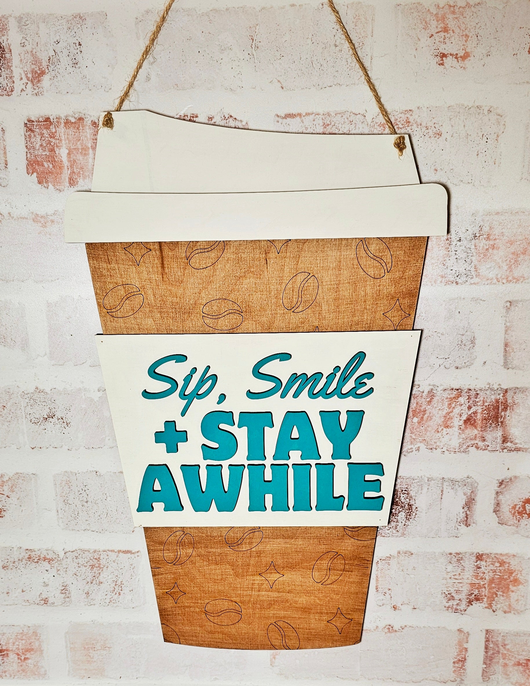 Welcome guests with a cup of coffee and a smile with our Sip, Smile and Stay Awhile Hanger. This 11.75 inch hanging sign adds a touch of warmth and invitation to your space. Perfect for your home or business, it's a fun way to welcome visitors to sit back and relax.