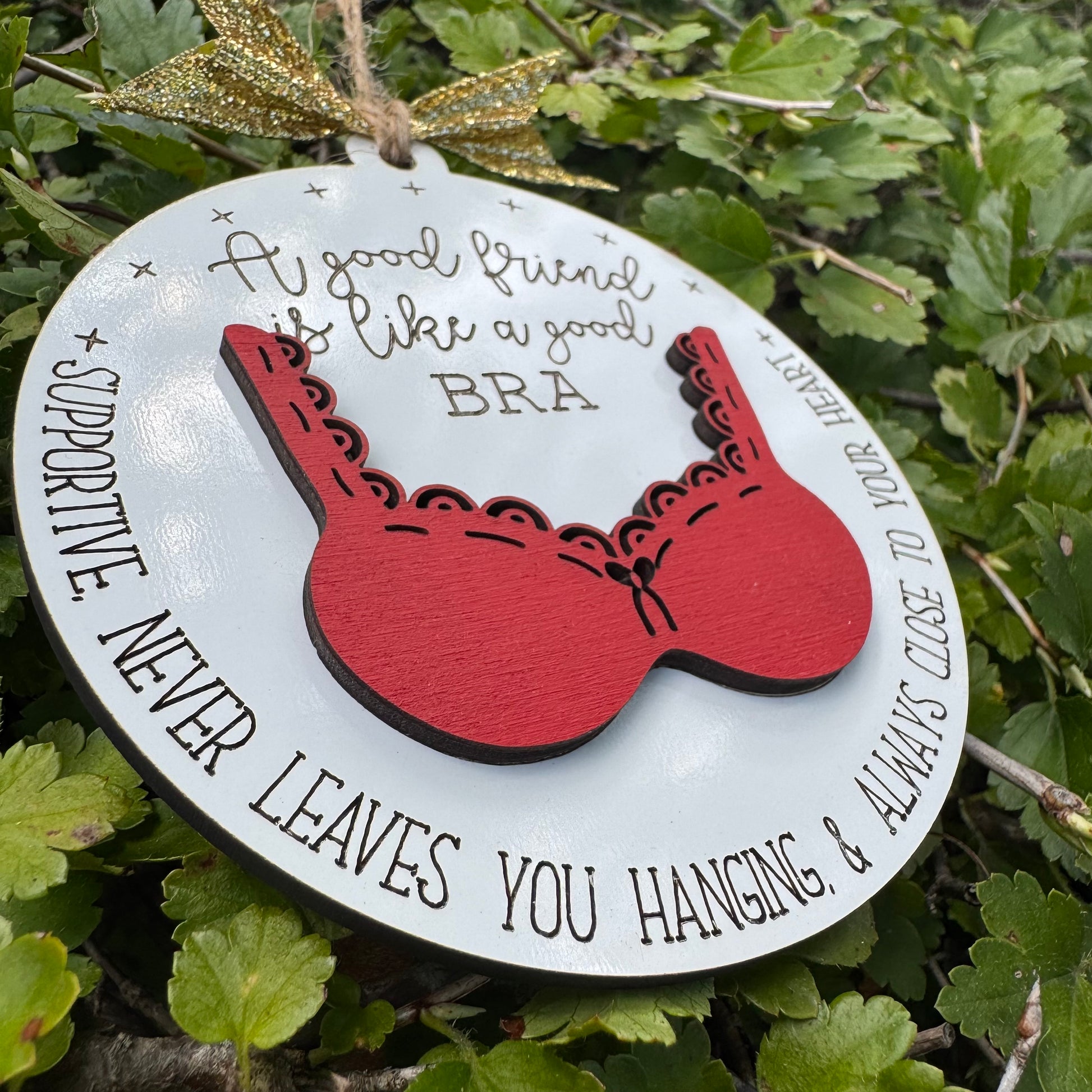 Celebrate friendship with this playful "A Good Friend Is Like Bra" ornament. Crafted from engraved whiteboard and a wooden bra painted in your choice of color, it’s a unique and fun keepsake. Perfect as a thoughtful gift, this ornament adds whimsy and warmth to any space. Ideal for friends who appreciate humor and heartfelt sentiments, it’s a delightful way to show how much you care. Brighten up holidays or special moments with this charming, customizable ornament that combines creativity and friendship perfectly.