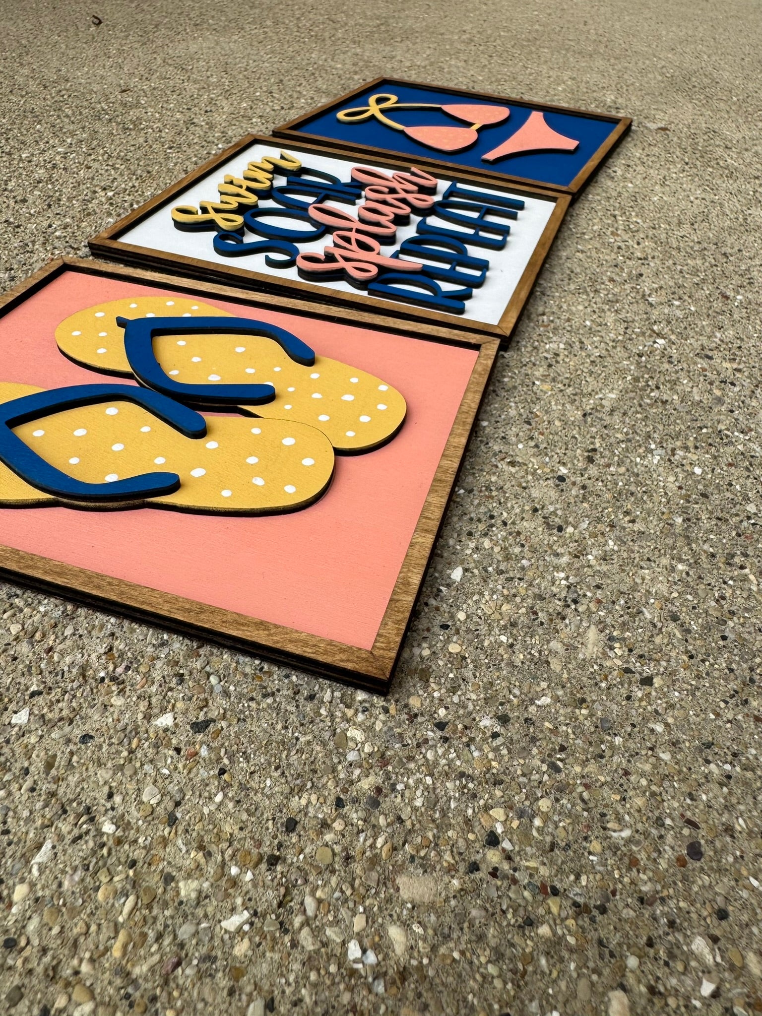 Make a splash with the Pool Party Mini Trio! This playful set of mini signs is perfect for adding fun vibes to your poolside gathering. Choose the DIY kit to customize your decorations or grab the ready-made set for instant charm. These signs pair perfectly with our "Welcome to the Pool" sign and "Life is Better in Flip Flops" shelf sitter, creating a cheerful, coordinated look that will keep the good times flowing. Dive into summer fun with this adorable trio!