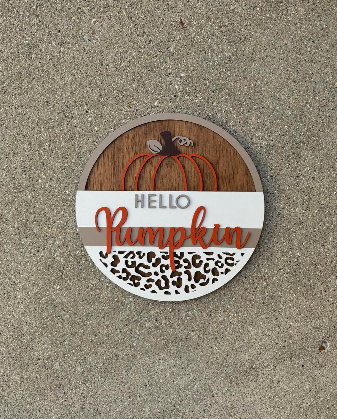 Add a touch of wild elegance to your fall decor with this sassy 11.75-inch round sign featuring a delicate pumpkin design accented with trendy cheetah print. The "Hello Pumpkin" message brings a playful, stylish vibe to your seasonal display. This unique combination of autumn charm and fashion-forward pattern makes a perfect statement piece for your home, porch, or entryway during the fall season.
